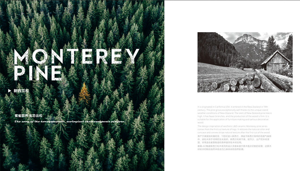 唯美L&D陶瓷新西蘭松木系列的設計靈感來源于原木首次切割的紋理;還原木材初次切割后自然本色及凹凸條紋狀的自然肌理。